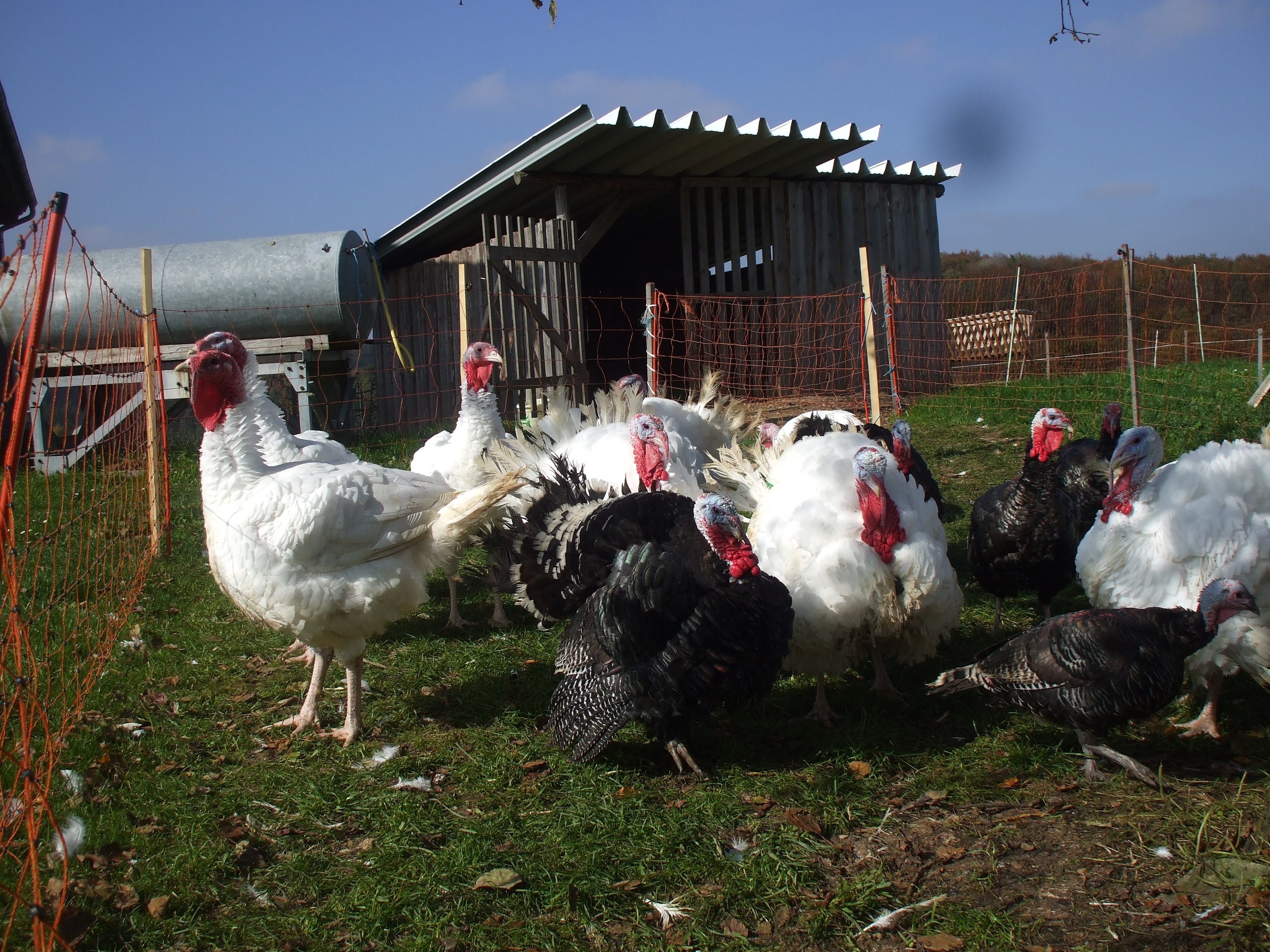 Unsere Puten leben in einem Schuppen mit großem Gehege und viel Fläche als Auslauf.