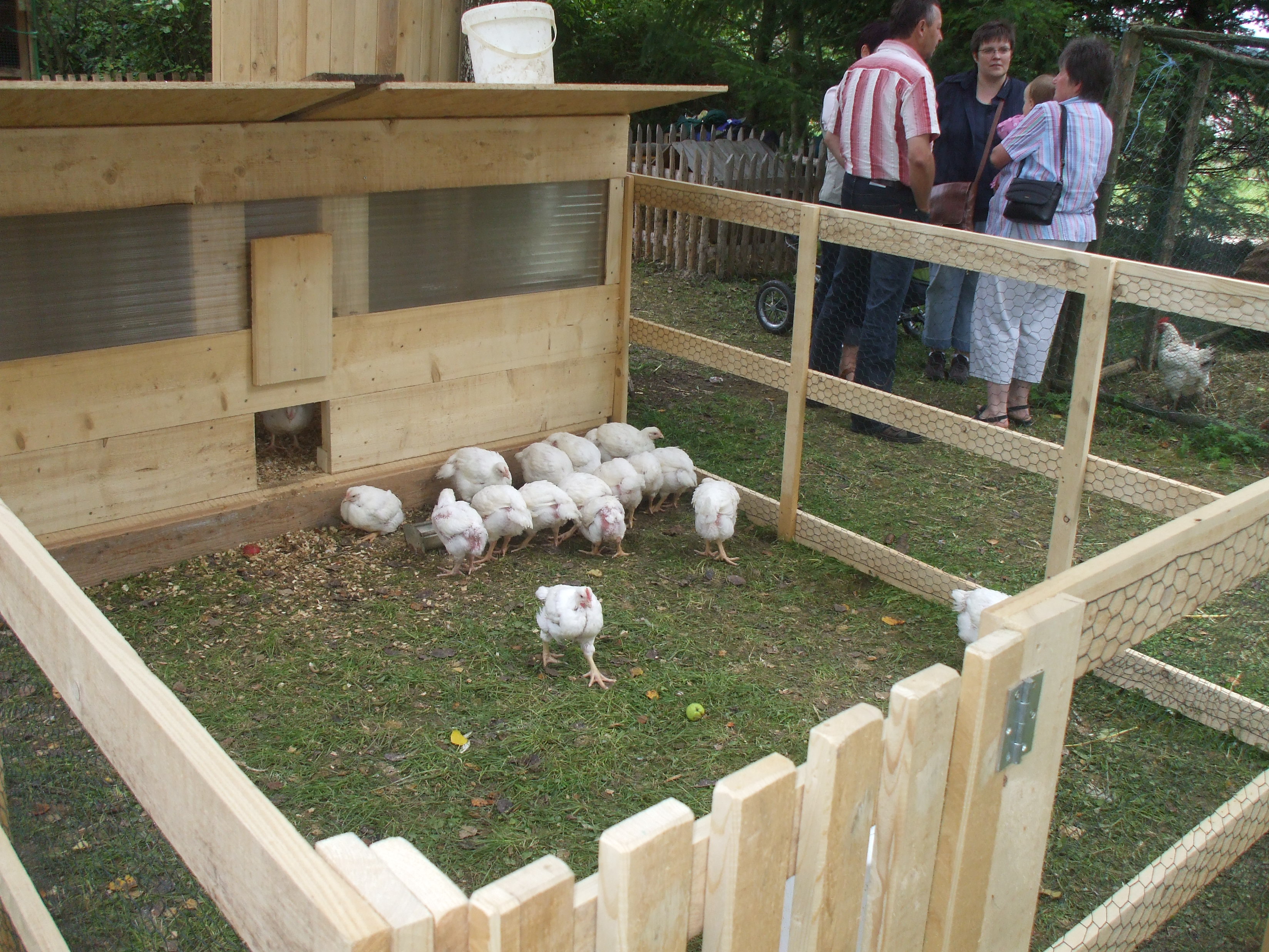 Unsere Hähnchen, hier auf diesem Bild gerade auf dem Hoffest, genießen ihren Auslauf ebenso, je größer sie sind, desto größer wird auch ihr Auslauf.